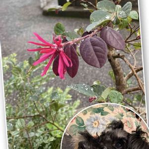 おはようございます😃 雨上がり…春に植えた紅花常盤万作 初めての花が季節はずれ、 一輪咲きました。 我が家のワンコとともにこんにちは🎵