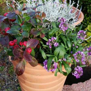 こんにちは😊 今日は朝方晴れてましたが予報通り雨が降って来ました☔ でも気持ち悪い位暖かくてさっきまで窓開けてました😅 先日お迎えしたチェッカーベリー🍒 植えるにはちょっと時期外したかも💦 昨日鉢の整理をして空いた鉢に寄せて見ました🎶 植え替え時期の3月位までこのままにしておくのも寂しいので寄せ植えの中にポットのまま突っ込みました😅 プラチーナとアリッサムはちゃんと土に植えてます😊