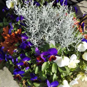 フリル咲きパンジー 🌱🌼パルムディレーヌ🌼🌱 11月末にUPしたパンジー白い縁取りが映えるように手前に濃いリーフをあしらって仕立て直しました♪ アオハダの木と細いリーフ🌿の所に雑貨屋さんで見つけたプレートを飾りつけたらo(^o^)o♪♪