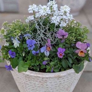 寄せ植え🌷*゚ 今朝はうっすらと雪が積もってたので、玄関ポーチで仕上げました⛄️❄️ 寒くても元気なお花たち! ビオラは見切り品😁だけど、キレイな色! すごく殖えるそうなので、結構スペース空けてみました(*′ᴗ‵*)