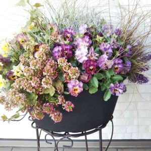 🍃ꕤ寄せ植えꕤ🍃 サトウ園芸さんの希少なパンジー・ドラキュラ🦇 花がら摘みはした方がいいけど、花がらさえも見栄えが素晴らしいそうです💜✨ リーフは葉牡丹チタニウムシルバー、クッションブッシュ”プラチーナ”どちらもシルバー系でカッコ良く渋めです👍🏻