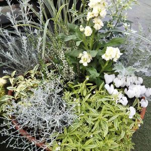 白いストックとガーデンシクラメン🌼🌿🌼🌿 プラチーナと斑入り🌿と一緒にお洒落な寄せ植えに出会いました🎶