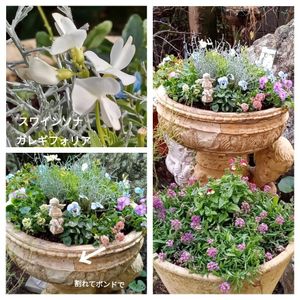 寄せ植え スワインソナ ガレギフォリア 中央に植えてます。 プラチーナ 2ポット買って半分に小分けして4株にして 中央に植えました。 ビオラ アリッサム 半分分けして植えました。 ギョリュウバイを植えてたら根が張り鉢が割れ接着剤でなんとか✌️使えるように 10年位になるかなぁ🤔 汚い鉢でm(_ _)m 手前の寄せ植え ネメシアが中央のも順調に育ってます。