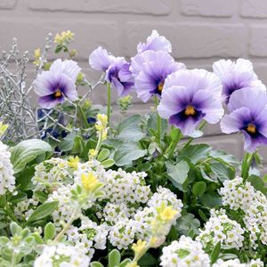 寄せ植え 𖡼.𖤣𖥧𖡼.𖤣𖥧 メゾンドビオラ青の聖騎士✼·゚ ロータスブリムストーン✼·゚ プラチーナ✼·゚ アリッサム✼·゚ アリッサムがモリモリになってきた😄