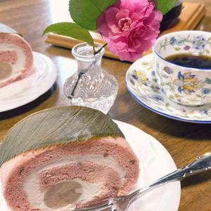 ツバキ & 桜ろーる🌸 冬の間重い雪を被って 寒さに耐えていたツバキ♡ 蕾を付け一輪咲きました💕 桜の葉を練り込んだスポンジに 白あんとクリームのロールケーキで ティータイム☕️ 優しい気持ちになります🥰