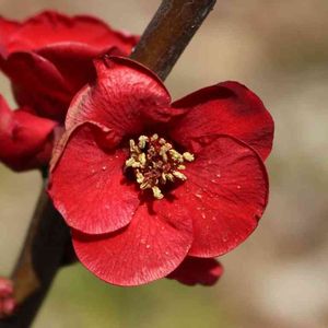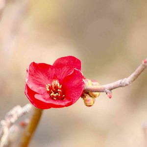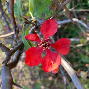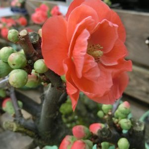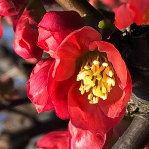 この鮮やかな朱赤の花はボケ(木瓜)長寿楽です。 ボケは日本原産のクサボケもありますが、主に中国から平安初期頃にもたらされました。 花色は赤・白・ピンク・オレンジなどがあります。 中国・日本原産。 バラ科ボケ属の落葉低木。