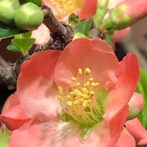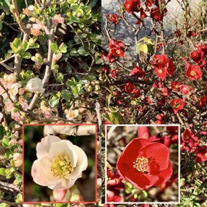 ボケの花、開き始めは白色だけだったのですが、薄く色づいてきて綺麗です😆 蕾も朱色のものがあったり、変化してきました✨ 蕾もまだまだ沢山あって、満開になるのが待ち遠しいです😊
