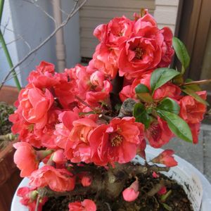 ひとつふたつだったボケの花、いっぱい咲いてきました😆 向こう側の鉢は、雪割草、南天、イトススキなど。 りんどうも新芽が出てきました🌱 昨年は花があまり咲かなかったので、今年は上手く育てたいと思っていますが、どうかなあ…😩☀️