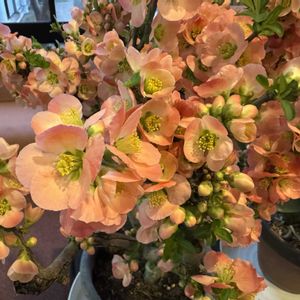 🏷️今日のお花・ボケ お義母さんのお庭の ボケとミツバツツジ 淡いピンク色で咲き始めて だんだんとサーモンピンクに 色変わりしていく可愛いボケです♡ カリンのように大きな実をつけます 2025.3.19