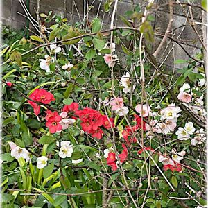 4月は卯月。穏やかな陽気に誘われ、草花が咲きだし、虫たちも土中から顔を出し活躍し始める季節。 私の散歩道の道際等の草花達も、その硬い殻を脱ぎ去って、自己表現を大きくし始めている--- 3月からの、草花達の満面の姿、姿---その9。 /ここに観る、赤と白、白の赤斑混じり合う花木々/ ボケ(木瓜) ・ボケ<木瓜>(ボケ属 バラ科) (備忘:ボケの属性等について3/4 ‘21)