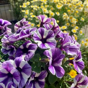 おはようございます😃 ペチュニア藤色小町の花が沢山咲いています💜 お迎えした時から苗がギュッとした感じがあって我が家の他のペチュニアより成長も花付きも良いです😮💕 ダラっと垂れずこんもりする感じで好きだなぁ😊 暫くピンチでお花を我慢した甲斐がありました🍀 雨晒しにしてるけど花弁がダメになっちゃうような事も無くて助かる🎶 奥の黄色はマーガレットソレミオです💛