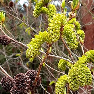 黄緑色💚の雄花が、春の山であちこち目立っています。 オオバヤシャブシの雄花です。雄花序は下向きですね。 松笠の様な果穂も見れます。