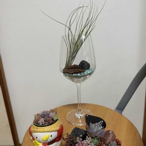 エアプランツ ジュンセアさんをワイングラスにインテリアガラスサンドの上にインテリアバークと溶岩石。小ちゃい恐竜のフィギュアが有ればもっとかっこいいかも? 会社の窓際族も仕立て直しました。