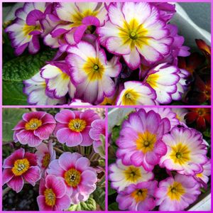 今日のお花の🩷プリムラ💜 ・プリムラはサクラソウ科サクラソウ属の植物で、花の色や咲き方のバリエーションが豊富で、冬から春にかけて花を咲かせる花です🤗💕 ①ピンク系のプリムラジュリアンをコラージュ ②紫系のプリムラジュリアンをコラージュ ③個性的なプリムラジュリアン、プリムラポリアンサ ④バラ咲きが美しいピンクと黄色のプリムラジュリアン ⑤小花が集まって咲くプリムラマラコイデス