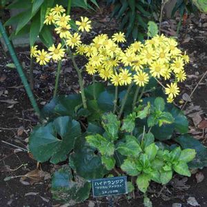 撮影:2019/11/06 稲毛メディア フラワー パーク 裏庭園入口に咲いていた ツワブキ、ハイドランドと一緒に植わっていました。 (@まめきちさんが教えてくれました)