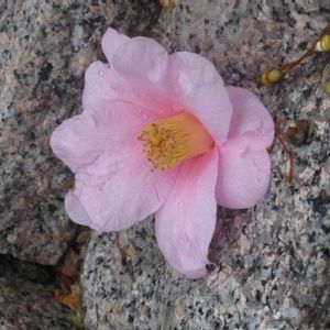 落ち椿。ピンクの椿の花言葉は「控えめな愛」だそうです。