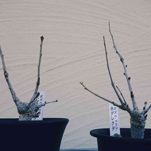 越冬場所は枝の立体パズル 芽吹く時期には外に広々並べてやれるからよし 1番手前のが新入り パキプスみたいな葉が出るらしい。楽しみ( ̄▽ ̄)フフフ