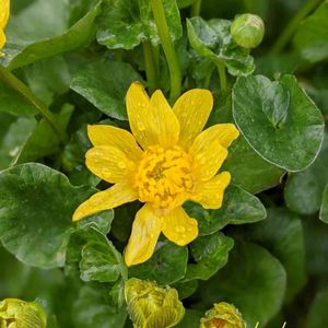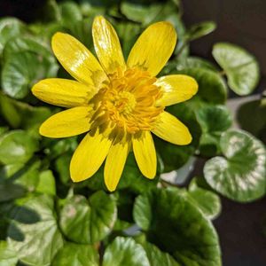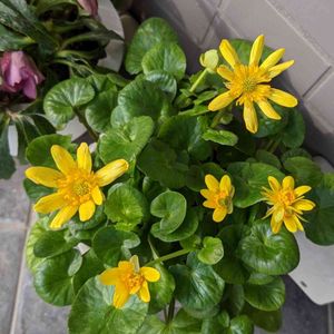 幾つかありますリュウキンカの最初の鉢が咲き始めました🌱🍀✨🎵 鮮やかな黄色い花が🌸 カラス葉の中にに映えていますよ✨✨✨🎶