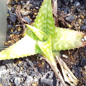 我が家の多肉の中でトップクラスのひねくれ者。 アロエ ティキタヒ。 冬をベランダ出しっぱなしで越せた子。 防寒対策はしていなかったが、夏からずっと設置していた遮光ネット下にいたのが少し影響があったのかどうか。遮光ネット下の多肉たちはほぼほぼ無事だった。 この腰が曲がったのを起き上がらせたいけど、木質化してきているから上向きになるように植え直せば良いかなと思いながら見ていたら、離れたところに子株? 違うアロエの発芽? 土が乾いていそうだし、近々植え直しのついでに子株(根)のチェックしてみるか。