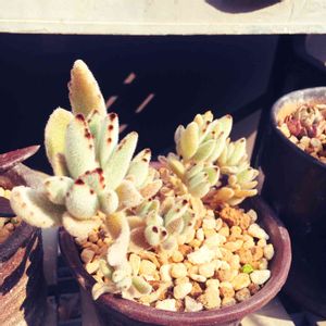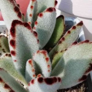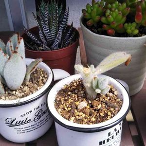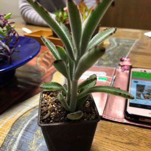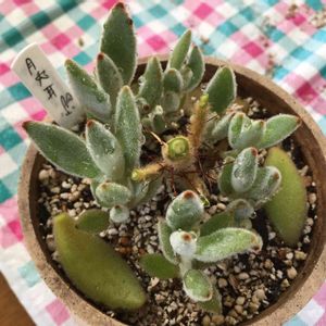 この子お店で見た時、 わぁ!茎や葉っぱが 動きがあって面白い🎵💕ってね でね、札見たら カランコエ、、、って。 えっ、この子カランコエ?‼😲 早速帰って調べたよ カランコエトメントーサC な、なんと、ツキトジだって‼ カランコエなのにツキトジ?‼ 確かにツキトジの茎と葉っぱが 暴れ伸びたら、、、 しかし、、、 カランコエトメントーサが ツキトジの別名とは!! こんなユニークなツキトジちゃんに出会えて嬉しい😃🎶 私の中のイメージが壊れた🎵💕