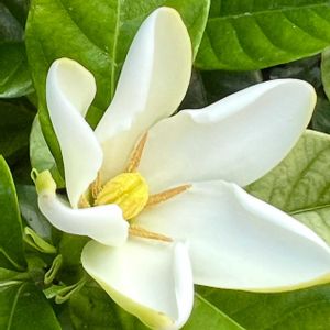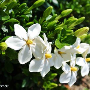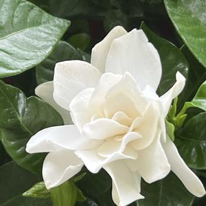 【梔子】《アカネ科》 花言葉 「とても幸せです」「喜びを運ぶ」 「優雅」「洗練」 ヤエクチナシは 西洋でコサージュに用いるために 栽培されていた植物で、 八重咲きの品種です 強い香りが特徴的 5~6cmほどの花が咲きます 実はなりにくい特徴