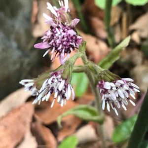 ツワブキのような葉っぱから伸びた茎の先に、 白〜桃〜赤紫色MIXの花が咲いていました🧐 《匂款冬》(においかんとう)、 ウィンター・ヘリオトロープかな❓ ※匂いは甘く、スッキリした香りがするそう 😷マスクしてて匂わず ※ 款冬(かんとう)=蕗(ふき) キク科のお花らしく、小さな小花の集まりです🌸 @白山神社