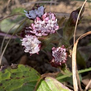 東京都八王子市 東京薬科大学薬用植物園にて 撮影日:2022-03-03 ニオイカントウ(匂款冬) ・地中海沿岸地方原産。 昭和の初期に渡来。 ・春、花茎が伸びてきて 白い花が咲く。 その後、ピンク色になっていく。 ・花は「桜もち」みたいな よい香りがする。 ・葉っぱは大きくて丸い。 蕗(ふき)に似ている。 名前の「款冬(かんとう)」は フキのことを指す。 ・別名 「ウインター ヘリオトロープ」