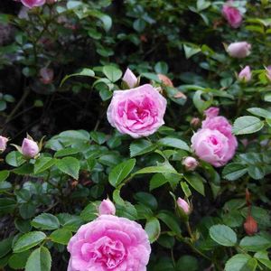 バラ 品種名は明かせませんが母の知人が作出したバラでその方の名前がついています。小輪の花が沢山咲きました。こちらは石垣から垂らして咲かせてます。