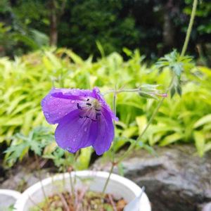 ゲラニウム‘オリオン’ 青いゲラニウム、ブルックサイドの血を引いているようです。 植え付け場所が無く、株が貧弱ですね😅植え替え時期じゃないけど、そっと庭に植え付けようかな。
