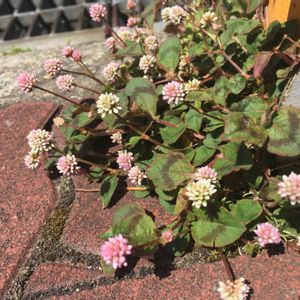 【ヒメツルソバ】Persicaria capitata タデ科イヌタデ属 花期7-11月 ヒマラヤ原産 葉に紫色のV字模様→タデ科特有。 花は咲きはじめは白く後でピンク色に変色する。 丈夫なのでグラウンドカバーとしても用いられる。 挿し木でも繁殖可能。