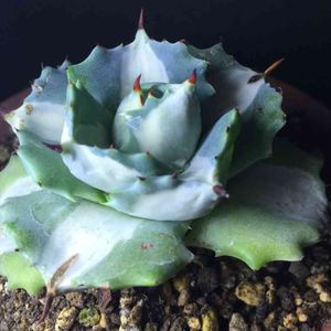 Agave potatorum v.verschaffeltii'Ouhi -Rajin' アガベ 王妃雷神錦 クリーム斑 7cm うちへ着た当初は、双頭の子で 全幅11cmだったんだけど 窮屈そうで、小さい子の方は 形が崩れてまでカキコになっていたんで 植える際に、株分けしようとしたら チビっ子の方が根無しでパキッと もぎれてしまったんだよね💦 クリーム斑だったので あわよくば黄中斑が出るかも💡 ・・・と欲をかいちゃったんだけど 今の色合いを見ると、白中斑やん😱 まっ、可愛いから許す♡(笑)