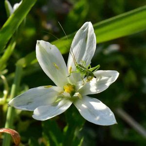 大甘菜オオアマナ 別名はベツレヘムの星 でしたね。 忘れられない英名です。 昨年と同じ場所にたくさん咲いてきてくれました。 ずっと待っておりましたので喜ばしい限りです。 花びらに居ますのはキリギリスさん。 土手のところに咲いていましたのでもしかしたなら花粉を食べに来たのでしょうか。 26日撮影