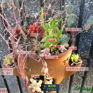 玄関横の12種吊り鉢. 2か月経って初冬の今、ツルマンネングサの葉は,溶けて無くなり,スッキリ. レフレクサム,沙座蘭,白牡丹は元気で変わらず。 乙女心,虹の玉,ブロンズ姫は秋の装い. 沙座蘭の間から、ようやく顔をだした氷砂糖は, 健やかなグリーン葉姿. 店じまいしたツル万年草だけど,よく見れば,根元に新芽を宿して、来年の準備してまーす. 1年あっという間に感じるのは,歳のせいかナ..