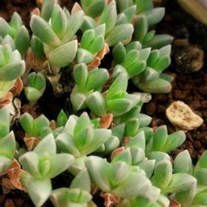 ルスキア属メセン科 インデュラータ 伸び悩んだ碧魚連🐟みたいな子ですね🤣 セダムと見せかけて…メセンですって🎵 うっすら紅葉もするみたい🍁 モリモリ丼になってほしいなぁ😊