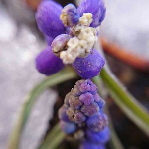 雪どけのヒヤシンスを撮影していた足元に、縮れたちっちゃなムスカリが咲いていた