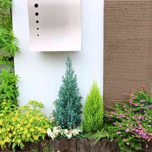 ポスト下エリア📪 ずーっと咲き続ける手間いらずなクフェアと黄色のお花(なかなか名前が覚えられません💦) ミニチュアな木2本も 植えたときより綺麗な形に育ちました🎄 左側から出ている以前ハーブ園で買ってきたレモンバーベナが何気にお気に入りです🌿✨