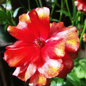 ラナンキュラス ラックス ハデス この花3度目の投稿です。咲き進んで最期の見頃くらいかな。 赤一色から金色が入ってきて、だんだんと金色の面積が増えてくる感じです。