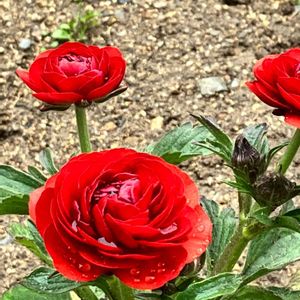 ラナンキュラス ラックス ハデス 鉢植えで2年目🪴 一際目立つ花色のハデスさん❤️❤️ 奥にうっすら見えるのは地植えのリュキア.* 𖥧⚘ 鉢植えの方が開花が早いですஐ☘︎︎