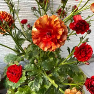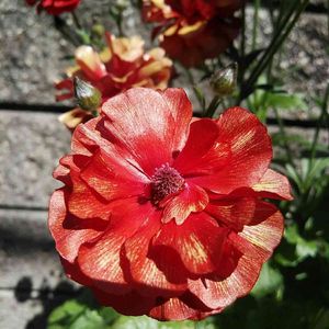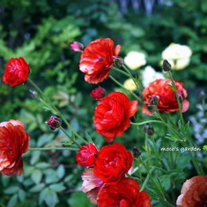 ラナンキュラス ラックスシリーズ こちらは真っ赤なハデス❤️ 西の庭でテカテカ光ってます😄 花付き良くて植えっぱなしがいいですね!
