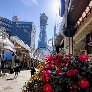 おはようございます🙇♀️ 昨日、えべっさんの帰り道から見えた新世界の通天閣🗼✌️ 店先で見上げる山茶花も🌺 まだまだ満開でした~💐💦🍀❣️