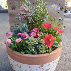 痛い腰に悩みながらも寄植えをしました(バカじゃん) スズランエリカ ブルーデイジー・アズールブルー ブルーデイジー・カシオペア(班入り) デイジー ペチュニア プリムラ・ウインティー