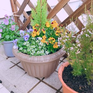 【冬の寄せ植え】 ゴミ箱に底穴開けて植えました😉 フタは鉢皿ピッタリサイズ😆