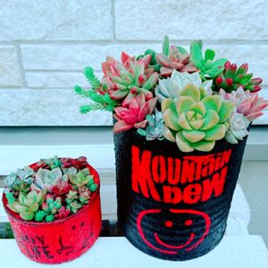 以前・・ 宮城のあいさんのプレ企画で当たった、可愛いリメ缶です💦 飾っていて・・やっと植えました😅 私の浅知識ですが、おそらく 双頭ブラックプリンスと群生的なトップシダビーじゃないかと・・推測してます💦 あいさん・・ありがとう( v^-゜)♪ございました⤴⤴