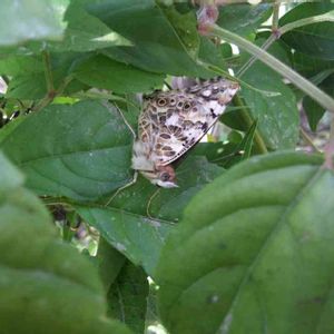 センダンの葉の間でジッとしてる ヒメアカタテハ 太陽の輝く青空の下を、花から花へ飛び回る生き生きとした蝶と対象的に、 余命幾許もなく、雨を避けて、寒さを凌いで、葉陰に身を寄せる蝶の姿は切ない💧✨