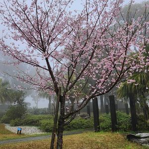 昨日の暖かさとうってかわり、鹿児島市内は、朝から雷雨⛈️ 気温も下がって、日中最高気温20℃。(昨日は27℃) お昼過ぎには、小雨になったので、吉野公園の桜を見に出かけました🚗 吉野公園は、小雨が降り、すっかり霧がかかって、ソメイヨシノは裸眼では遠くにやっと見えました。 悪天候で、見物客が他にいなかったので、サクラ並木の近くまで行きませんでした😣 🏷️今日のお花 サクラ ①❇️神代曙 ソメイヨシノに替わって、これから「令和の桜」と、各地で注目されている「神代曙」というサクラです。 ピンク色が、やや濃いですね💖 ②~⑤❇️ソメイヨシノ ②正面入口のpicです。 天気が良い時は、この向こうに錦江湾を挟んで桜島が望めるのですが、、