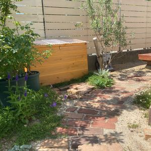 まだまだ作り中のレンガの小道ゾーン🧱 庭の端っことか、木の後ろとか、何植えたら良いのか分からず🤔まだまだ空白が多いです😅 中央の木の箱は、キエーロという生ゴミ処理のコンポスト。 ふるさと納税の返礼品で頂いたものだけど、 土に埋めるだけで文字通り生ゴミが消えるので、オススメですよ〜✨