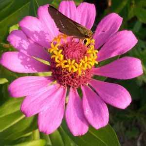 通りすがりに見かけました、とあるお宅の畑に咲く、百日草(ヒャクニチソウ)とイチモンジセセリ☺️ ヒャクニチソウにイチモンジセセリが花の蜜を吸いに来ていました😄 夕日に照らされ、綺麗に咲いていました😄 2022/09/13(火)にスマホ📱で撮影しました☺️