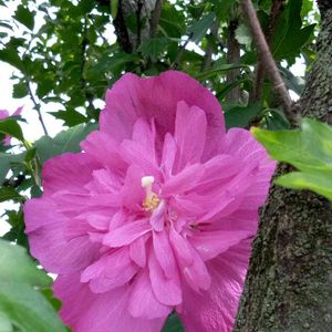 通りすがりに見かけました、ピンク色のムクゲの花☺️ 日差しに照らされ、元気に綺麗に咲いていました😄 (木の陰から ヒョッコリはん😅) 2022/06/27(月)に撮影しました☺️