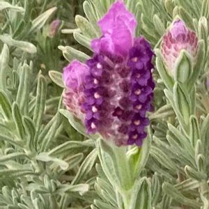 通りすがりに見かけました、歩道脇の花壇のフレンチラベンダー☺️ (スマホで検索しますと、フレンチラベンダー と出ました🙇♀️) 小雨が降っていましたが、元気にキレイに咲いていました😄 2022/04/21(木)14:09.小雨 スマホ📱で撮影しました☺️