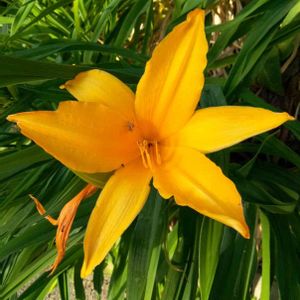 通りすがりに見かけました、日光黄菅(にっこうきすげ)の花☺️ 夕日に照らされ、元気に綺麗(きれい)に咲いていました😄 2022/04/25(月)夕方・晴れ スマホで撮影しました☺️